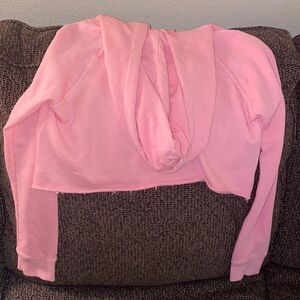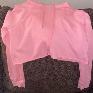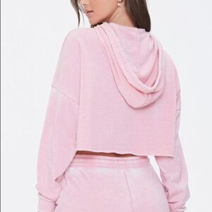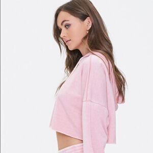 ✨ A fleece hoodie featuring a cropped hem, dropped long sleeves, a drawstring hood, and a cropped raw-cut hem.