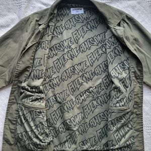 FA- Field button up jacket. Oversized pockets on front. Large graphic on back of jacket.