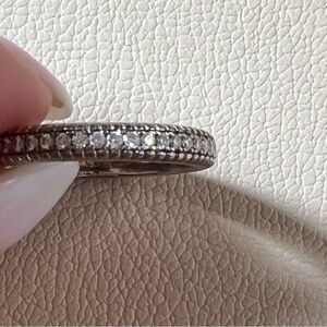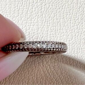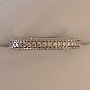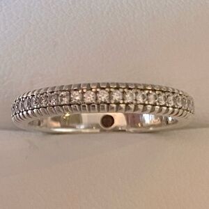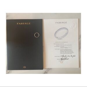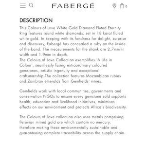 Gorgeous Fabergé Colours of Love Diamond Eternity Band. 18k white gold 44 round white diamonds = 0.39cts (F VS+) 1 round ruby = 0.02cts. Size 5.75. Excellent Condition. Comes with Certificate of Authenticity and Original Receipt. Lifetime Warranty. Much sparklier in person. I’ll try to get better pics. Price is firm.