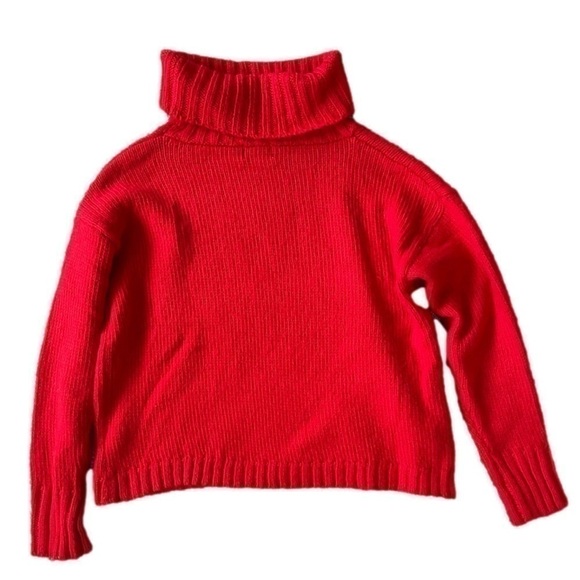 This red Fable sweater features a high chunky turtle neck, ribbed detailing on the cuffs and hemline, and a soft fabric. Looks great tucked in or left out!