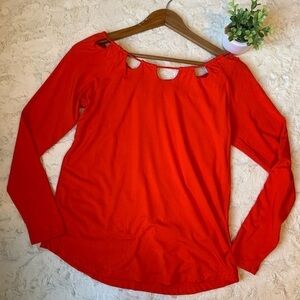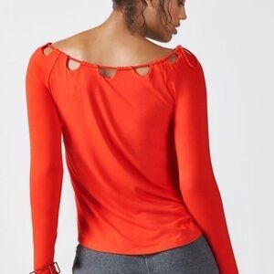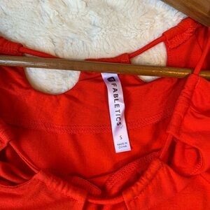 Excellent condition Fabletics Carla top. Red/orange color. Super soft and stretchy. Fabric tag is gone but it is 95% rayon and 5% elastane. Adjustable side tie at neck with keyhole accent all the way around. Breathable moisture wicking fabric. Got from yoga to a night out in this versatile top. Curved hem.