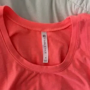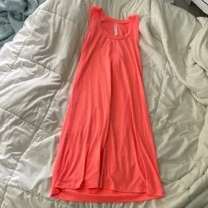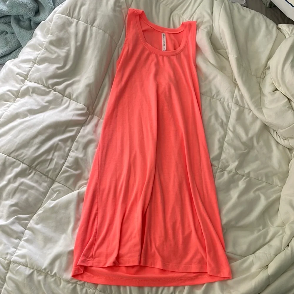 coral color with a cross of fabric in the back of the dress- great condition