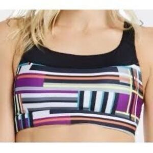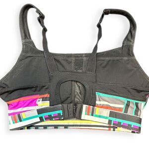 FABLETICS Women’s Multicolor Black Sintra High Support Sports Bra. Bright geometric stripes with a secure back hook closure and adjustable straps. Built for performance and style — ideal for high-impact workouts. Size tag is missing, but fits like a Medium — please refer to measurements!