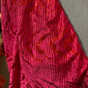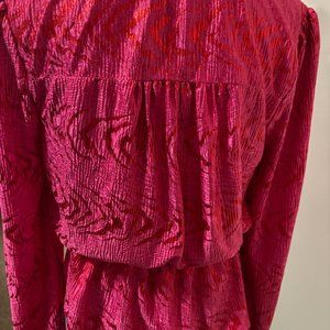 FAB'RIK LADIES SIZE MEDIUM V- NECK PULL OVER BLOUSE. HOT PINK WITH METALLIC THREADS FOR THAT EXTRA SHINE.GATHERS IN THE WAIST FOR BLOUSY LOOK. LONG SLEEVES. GATHERS ACROSS THE SHOULDER.95% POLYESTER,5% SPANDEX, HAND WASHABLE.