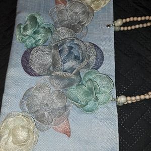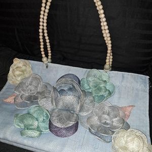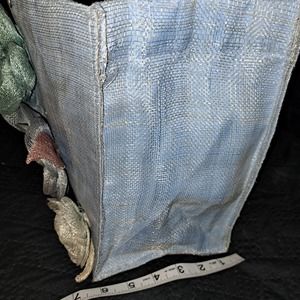 FABULOUS FIND! Very Vintage and in excellent shape - RETRO Circa 1950's made baby Blue Burlap Dyed bag with straw lining and handmade flower front with wooden beaded wired handle. 18 inches long - 6 inches wide and 10 inches tall not including handles. This is a real 1950's vintage item and in excellent shape with many years of use ahead! It will be the talk of the the town with this lovely piece of art on your arm! Made so well it can last a lifetime.