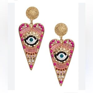 These stunning heart-shaped earrings feature a captivating eye design, adorned with pink and gold accents. Perfect for adding a bold statement to any outfit.