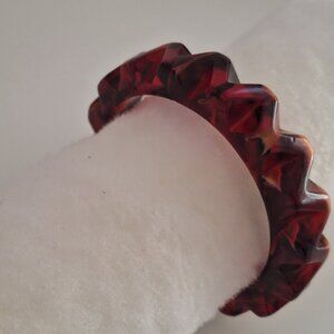 This rear bakerlite bracelet has fabulous colors of red orange black green yellow on one side and red on the other. Looks like a gear. They would wear them stacked! Must of looked terrific!!!!! This bangle is a real show stopper!!!!!!