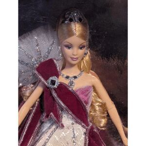 The ‘Holiday’ by Bob Mackie is a 2005 Barbie series that has been specially designed for kids aged 6 and above. The ‘Holiday’ by Bob Mackie Barbie doll wears a finely crafted gown, decked with a glitter-printed jacquard, a mushroom-pleated tulle, a sparkle organza, a satin, and a flock sash with a beautiful silver edge that compliments her gown. This 2005 Barbie series doll has a sparkly printed starburst pattern decorated on her shoulder, which adds style to the outfit. This Barbie doll wears charming accessories that include a brooch, a necklace, a pair of earrings, and a crown that add to her ensemble.