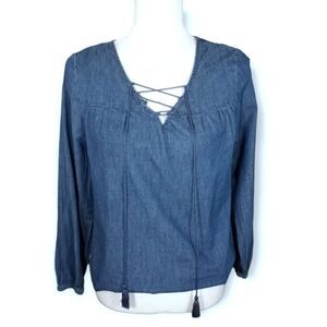 FADDED GLORY DENIM BLUE LACE UP PEASANT TOP SZ.S EUC.