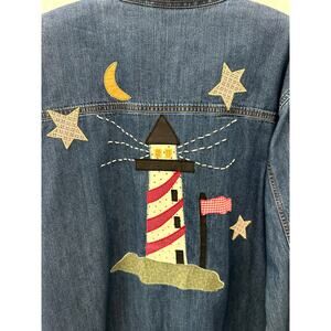 Tags lighthouse jacket, denim applique jacket, patriotic stars, coastal grandma, beachy boho shacket, red white blue jacket, Americana denim shirt, whimsical embroidered jacket, 90s Y2K style, plus size jean top, fall fashion, Fourth of July fashion, lighthouse shirt jacket, vintage denim shirt