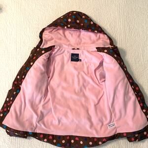 Adorable Girls chocolate brown winter puffer snow jacket with fleece lining and hood. All-over pattern of hearts and polka dots - pink, purple and turquoise colored hearts and white, pink, turquoise and navy polka dots. Zip Up front with velcro zipper cover. In excellent used condition! Size Large 10-12. Pockets in the front have snap closures. Warm and cozy soft baby pink fleece lines the entire coat. Extended length to fully cover waist and top of pants.
