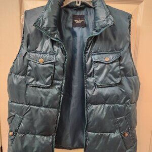 THIS FADED GLORY PUFFER JACKET IS A YUMMY COLOR OF DEEP TEAL. IT HAS TWO FRONT SNAP POCKETS AND TWO SNAP SIDE POCkETS. THE FRONT ZIPPER CLOSES THE COLLAR AROUND THE NECK FOR A COZY WARMTH. A ZIPPER ON HOOD IS ALSO INCLUDED. THE ARMPIT TO ARMPIT IS 22" AND THE NAPE TO THE HEM IS 25". IT IS LISTED AS A SIZE LARGE.