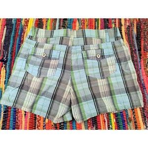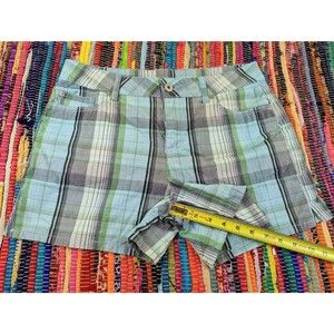 FADED GLORY Women 10 Blue Green Plaid Mid Rise Stretch Chino Shorts Flap Pockets