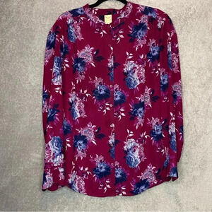 FADED Glory XXL Top Shirt Burgundy Floral Long Sleeve Button Up Casual P19
