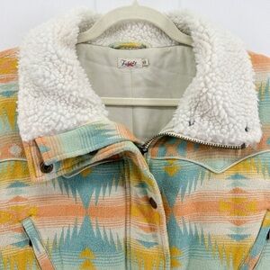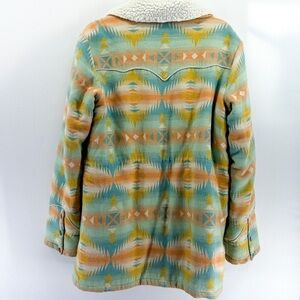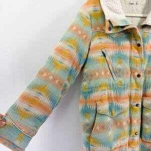 This organic-cotton jacket blanketed with a Southwestern-inspired pattern in a sunrise palette is a perfect transitional piece for your wardrobe. Plush faux shearling along the inner cuffs and collar adds cozy warmth to the outerwear, while an interior drawstring waist ensures the best fit possible.