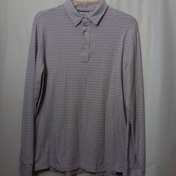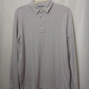 Size Medium Men's Faherty Movement Polo striped long sleeve in multi colors of red, white, and blue.The material is 57% organic cotton, 39% modal, and 4% elastane in good preowned condition