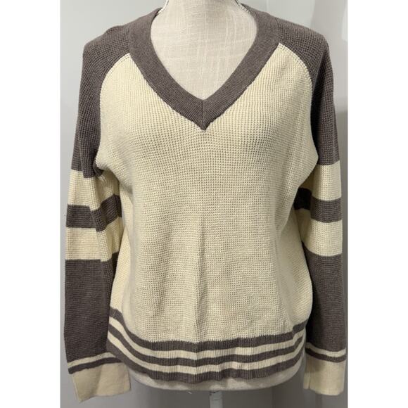 FAHERTY Throwback Waffle V-Neck Fenway Cream Brown Cashmere Cotton Size L Large