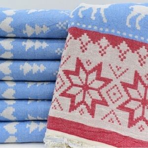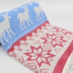 NWT FAIR ISLE Modern Classic Jacquard Blanket Towel in Red Blue Reversible Weave