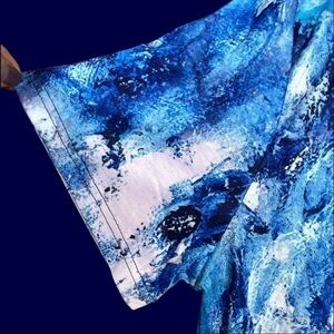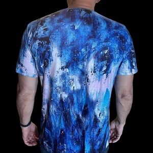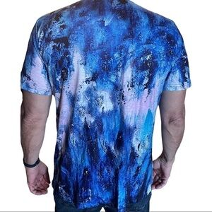 NWOT Mens faith based cross T-shirt in turquoise and blue. Size XL perfect condition. Feels like a polyester or rayon type mixed fabric