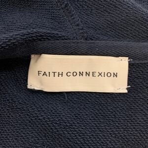FAITH CONNEXION sweatshirt comes in a navy cotton featuring a front embellishment, side lace up detail, hooded, front pockets, back painted design, and a full zip up closure.