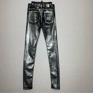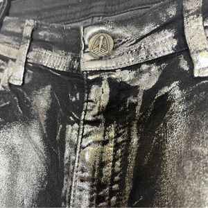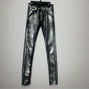 •Features: Black and silver coated skinny jeans. Fabric has generous stretch.