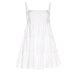 White mini dress with a square neckline, delicate over the shoulder straps, and tiered a-line silhouette.