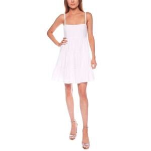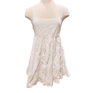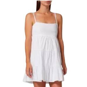 White mini dress with a square neckline, delicate over the shoulder straps, and tiered a-line silhouette.