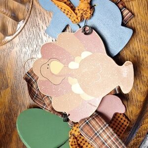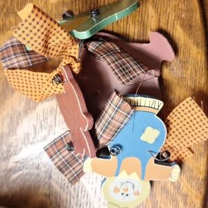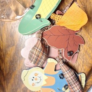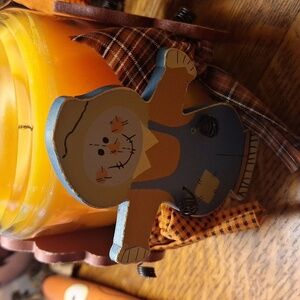 FALL DECOR CANDLE SURROUND AND 2 WOODEN PAINTED DOWELS. Candle surround has 4 wooden painted sections; corn, maple leaf, scarecrow, and a turkey. The sections are connected by wire and have fabric bows. The 2 painted dowels are cute pumpkins and can be hung or used like candles in candle holders.