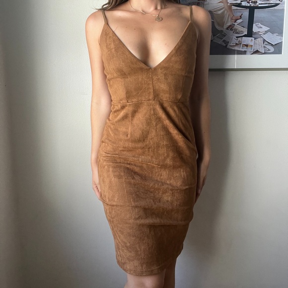 Perfect dress for fall. Brown soft suede- ish material. Would be great for a fall wedding or event!