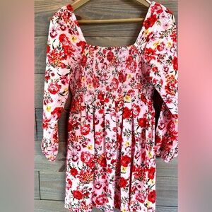 THIS DRESS IS SO PRETTY WITH FALL FLORAL MAXIMALISM - SIZE SMALL - COQUETTE STYLE - SMOCKING AT BODICE - LIGHT PINK BACKGROUND WITH RED AND YELLOW FLORALS - P2P 14.5” / SLEEVE LENGTH 20” FROM SHOULDER / WAIST 26” / LENGTH FROM TOP OF BODICE 26”