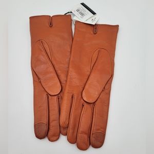 Coach sheep leather women's gloves, lined in Cashmere. The color is called Sunset, and it is gorgeous! They are so very buttery soft! Adorned with a tiny "C" at the cuff, these are classy gloves. They have never been tried on, so they are not stretched by any one hand.