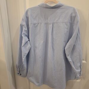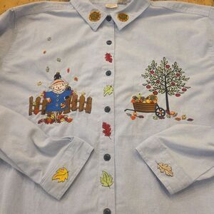 This adorable vintage chambray shirt is perfect for fall! The light wash button-up shirt features intricate embroidered designs, including a charming scarecrow by a fence and a wheelbarrow overflowing with gourds, Apples, and sunflowers next to a tree. The details continue down the front with embroidered fall leaves and cute sunflowers on the collar. This piece is a unique and festive addition to any wardrobe, ideal for autumn events, Thanksgiving gatherings, or cozy everyday wear.