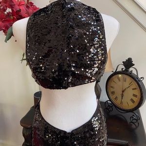 SLEEVELESS NEW WITH TAGS BLACK SEQUIN DRESS. SEXY BACK AND PLUNGING NECK LINE