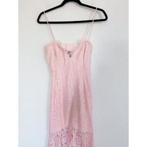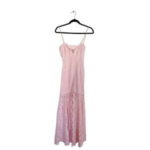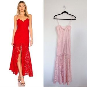 Elegant lace distinguishes a scene-stealing gown designed with a delicate sweetheart neckline, cutout back and a sultry thigh-high slit at the front.