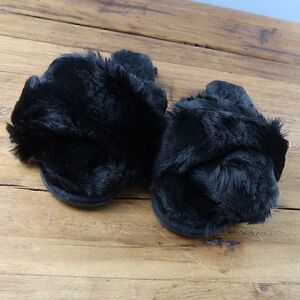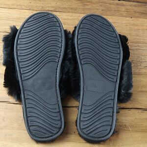 FAMIPORT BLACK FLUFFY CROSS BAND HOUSE SLIPPERS SIZE LARGE
