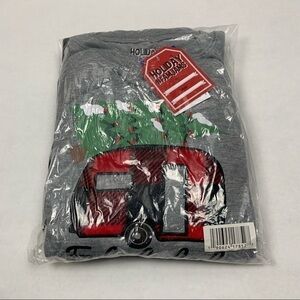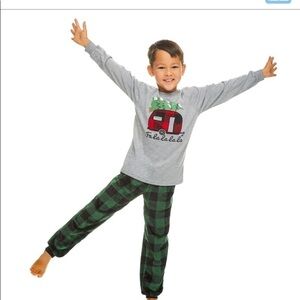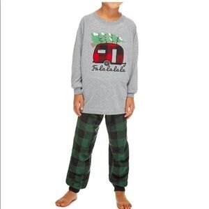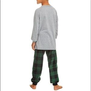 Condition is new with tags. 2 pc holiday pajama set comes with green and black plaid pants and long sleeve Gray shirt with camper and greet graphic on front.