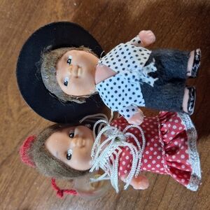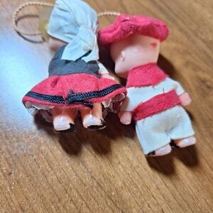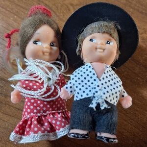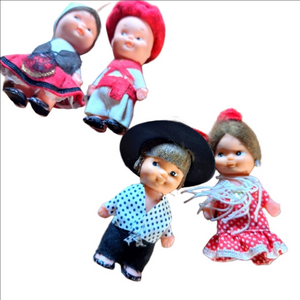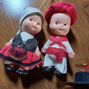 You're looking at VINTAGE 1960s FAMOSA DOLL MINIATURE COUPLE W/ TRADITIONAL French? COSTUMES . The dolls are made of a celluloid with a hard plastic body. They have jointed head, which feels tight. They're in good pre-owned condition with some signs of wear as scratches and some soiling. The clothes are in good condition with some some clothing that could be re-attached better on one male figure suction cup and are still attached . Some loose threads. Each measures 3" (8 cm) tall approx. I found them at an estate sale. Of a French Couple .the was originally from France husband met her during War times .these treasures are from the 60s souvenir most I've found are made in Spain. They traveled often to France and Canada where family immigrated
