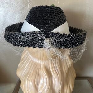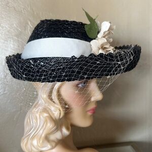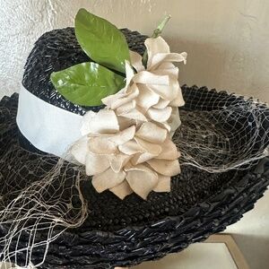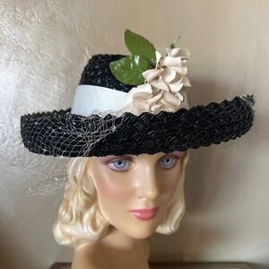 This is a beautiful and elegant 1940s' black straw wide brim hat. The crown is flat at the top and it is slanted, per 1940's fashions. The crown is surrounded by an upturned wide brim. There is a light cream colored band around the crown, plus a veil that is attached so it does not fall over the face. At the front there are gorgeous creme colored fabric flowers + 2 green leaves.