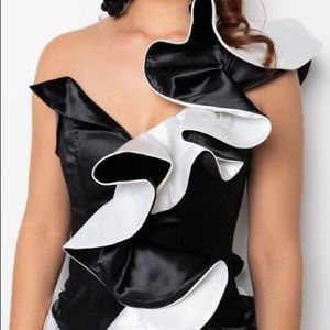 BLACK AND WHITE SATIN RUFFLE TOP
