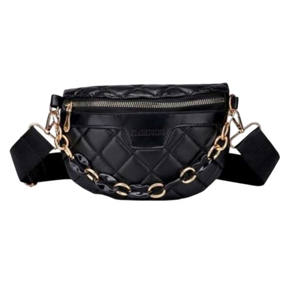 FANNY PACK Designer Paris Style Bum Bag SAFETY Bumbag PUFF QUILTED Bag Black & Gold Modern Chain Contemporary City Chic