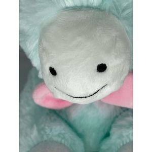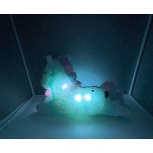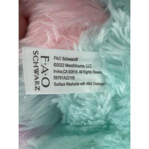 A plush stuffed toy unicorn by Fao Schwarz from the Glow Brights Collection. Color is light bluish-green (one of the harder to find colors) with pastel rainbow mane and tail, a pink bow attached to neck. Both the horn and the hooves are sparkly silver. It is approximately 15" long. It's facial features are stitched. Squeeze or hug for magical sounds and lights throughout the body. This is from a plush - stuffed animal collector and was displayed only. It is tested and works but batteries will not be shipped with it. It is very soft and looks new. Tushy tags are intact with a date of 2022.