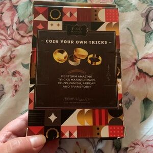 FAO Schwarz magic trick set with dynamic coins. Features gold-colored coins and rings. Perfect for magic enthusiasts.