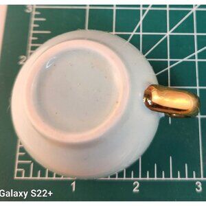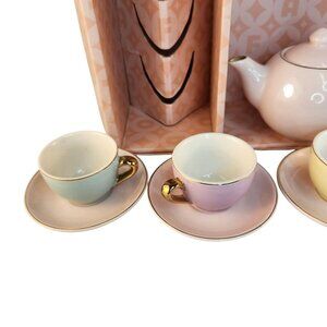 Elegant FAO Schwarz hand-glazed ceramic tea set featuring a teapot, four cups, and matching saucers. Crafted for charm and sophistication, this set is perfect for any tea gathering, offering a splash of color with its pastel hues and gold accents.
