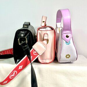 • Features: Wide iconic strap (pink), metallic emblem (black), embossed pattern, white with pattern carryall. All bags feature mini add-on toy keychain.