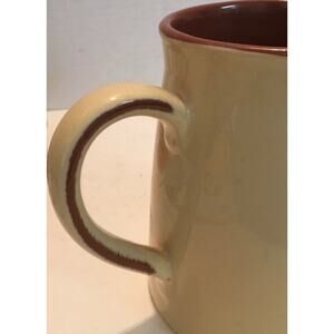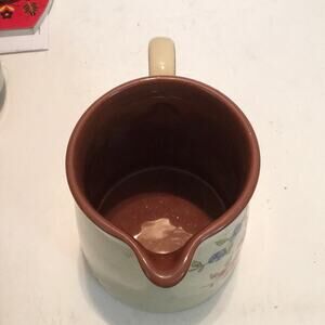 Creme colored unique vase/ pitcher for drinks to floral arrangements... w/ delicate dancing florals & leaves painted on one side. Blues, reds pinks greens maize & soft ochre browns.. Handle & interior glazed w/ rich cocoa brown finish. NO cracks or crackling. UNIQUE PIECE.🔆