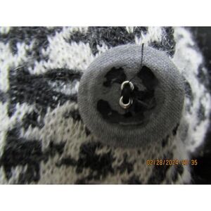 THIS SWEATER IS IN VERY GOOD CONDITION THE 2 BUTTONS DO SHOW SOME WEAR PLEASE SEE PICTURES. THE SIZE TAG IS MISSING BUT ACCORDING TO THE MEASUREMENTS I WOULD SAY M/L. THE FABRIC TAG IS ALSO MISSING BUT THIS IS SO SO SOFT PROBABLY CASHMERE OR CASHMERE BLEND