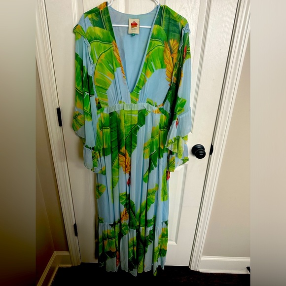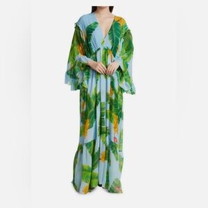 Designed with long butterfly sleeves and a plunging neckline, this Fresh Bananas maxi-dress by Farm Rio features delicate ruffle trim and a concealed zipper at the side seam.