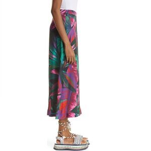 A lightweight woven midi skirt is featured in a colorful foliage print for tropical appeal in your weekend wardrobe.