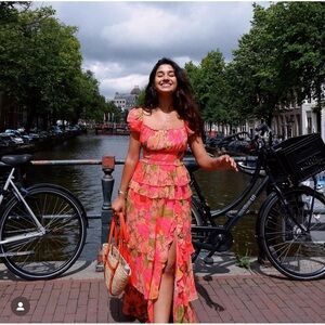 Floral maxi dress in tiered silhouette w/ ruched detailing and elastic waistband