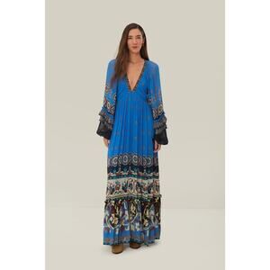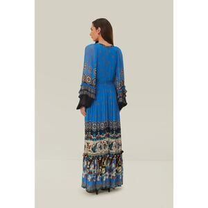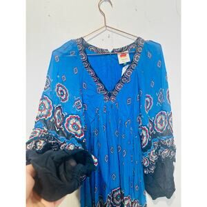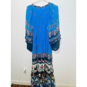 FARM RIO Blue Black Bell Sleeve Ainika Tiles Flowy V-Neck Maxi Gown Size XS